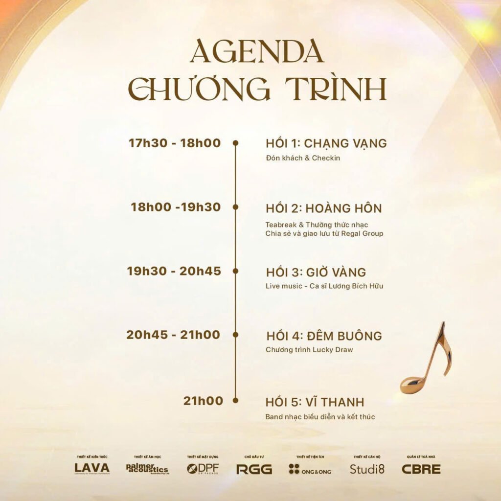 - 18h00 – 19h30 | Hồi 2: Hoàng Hôn – Teabreak thư giãn, thưởng thức âm nhạc nhẹ nhàng và giao lưu cùng Regal Group.